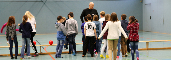 Neben solch anstrengender Forscher-Arbeit kam aber auch die sportliche Aktivität nicht zu kurz. Mit Herrn Sensenschmidt tobten sich die Kids in der Sporthalle aus – hier ging es neben dem Sport um viel Spaß und Action!