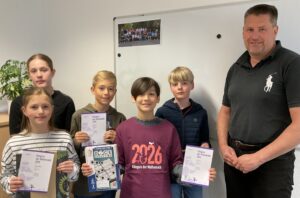 Wir gratulieren Merle, Emil, Noah, Theo (alle 5a) und Leni (6c), die beim diesjährigen Känguru-Wettbewerb der Mathematik in ihrer Altersklasse jeweils 2.-3. Preise erzielten.